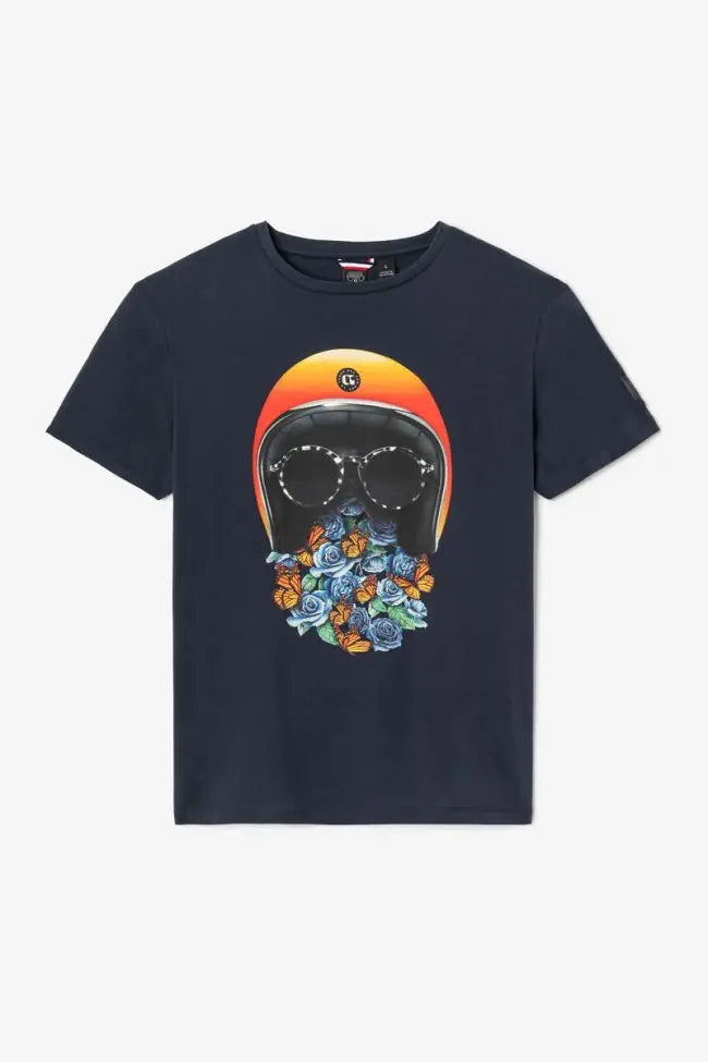 -T-shirt à manches courtes-Colori bleu marine-100% coton-Coupe droite-Logo imprimé casque avec fleurs-Patch brodé sur la manche gauche